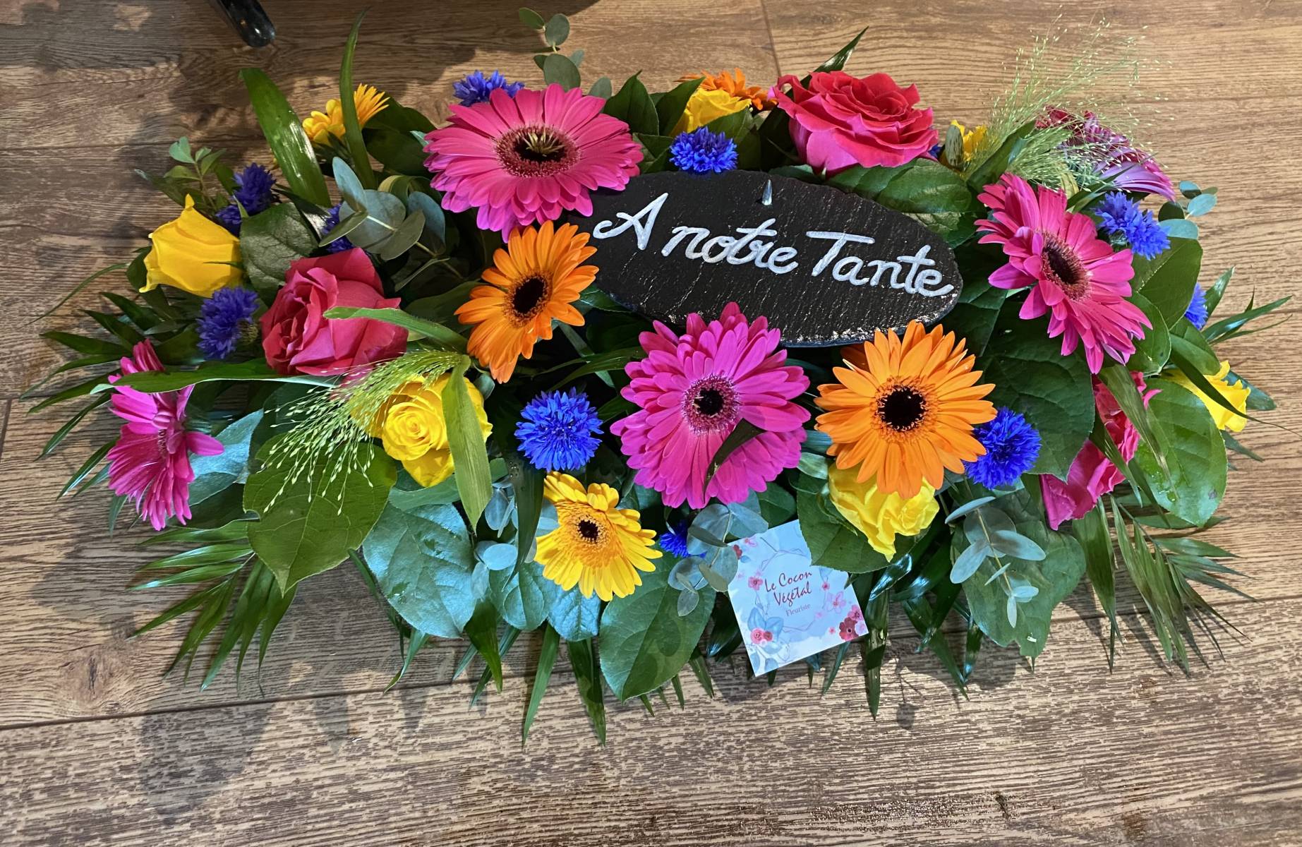 Gerbe - Composition Florale Ovale (mélange de fleurs : gerbera, roses, bleuets..)